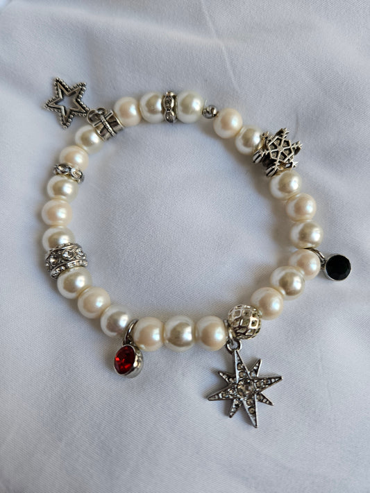Pearl charm bracelet, winter/holiday theme, stretch fit