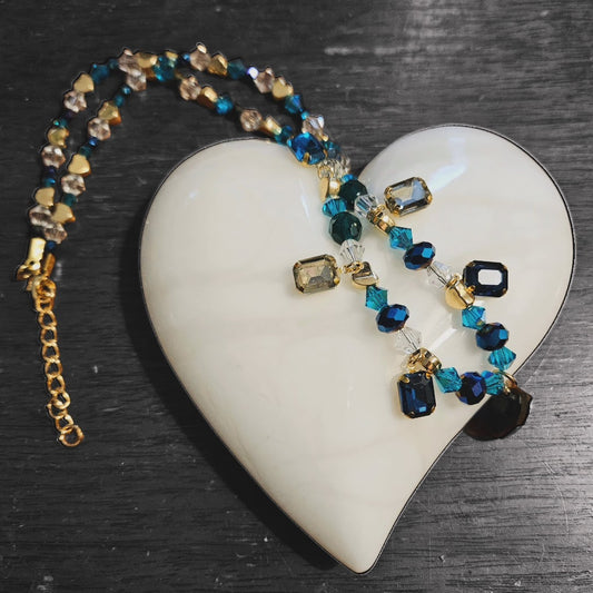 Necklace, blue and green gem charms, gold tone beads, dark blue crystal teardrop charm