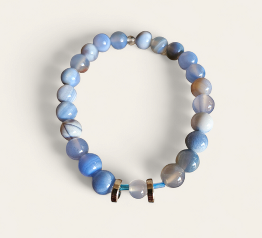 Blue stone bracelet with silver slider spacers, stretch fit, handmade