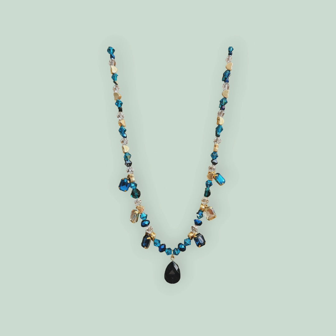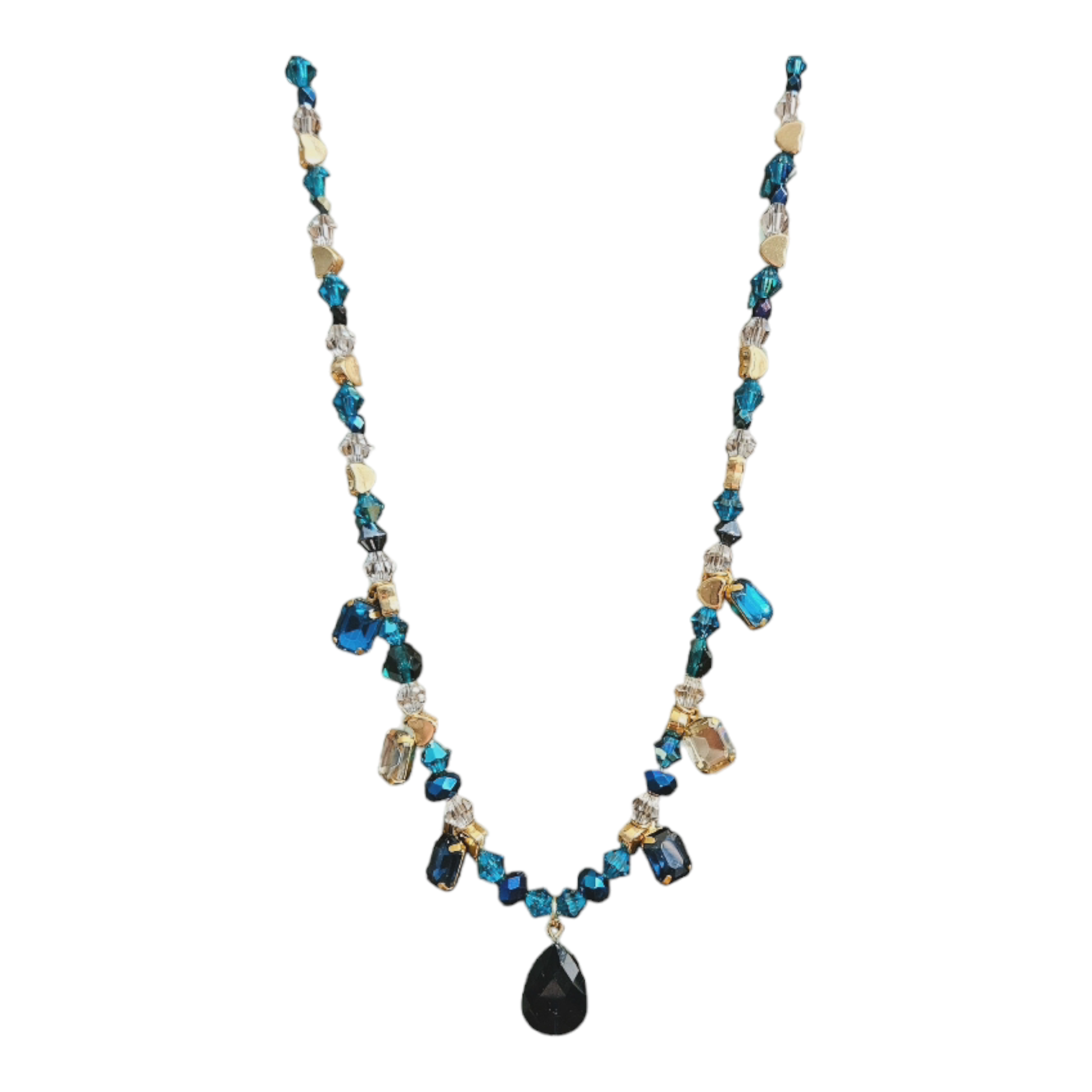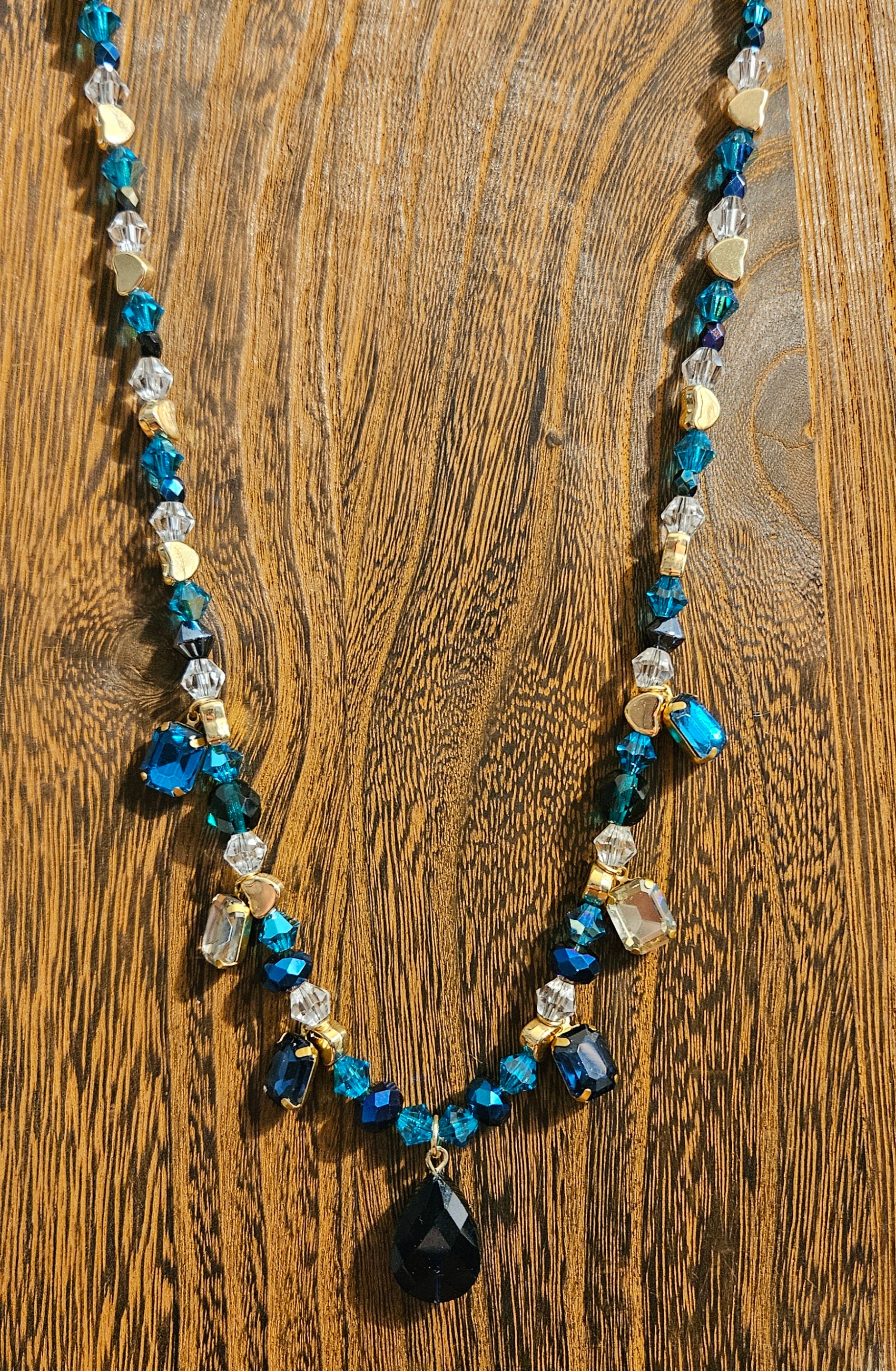 An elegant, handmade necklace of blues and gentle greens. Six faux gemstone charms in blue, green, and clear. Strung with blue crstal and gold tone beads. The focus is a dark blue crystal teardrop pendant. Clasp closure. 20 inches. Made in USA. A piece to enjoy and cherish.